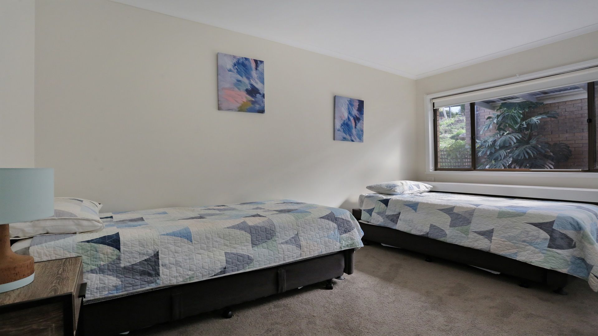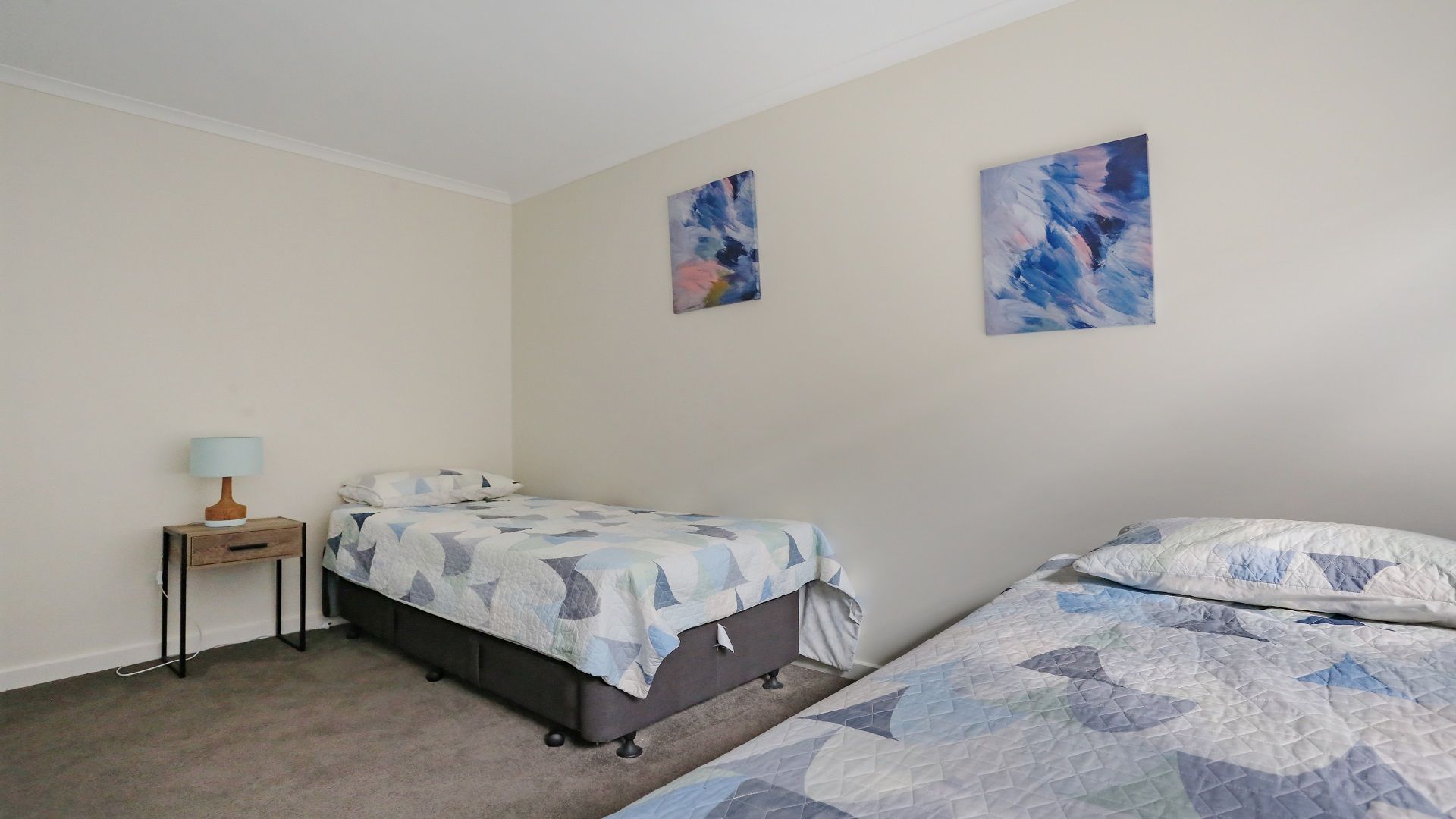 Large Bedroom: The downstairs bedroom features a queen bed and a single bed, comfortably sleeping 3 guests. It's perfect for families or small groups.